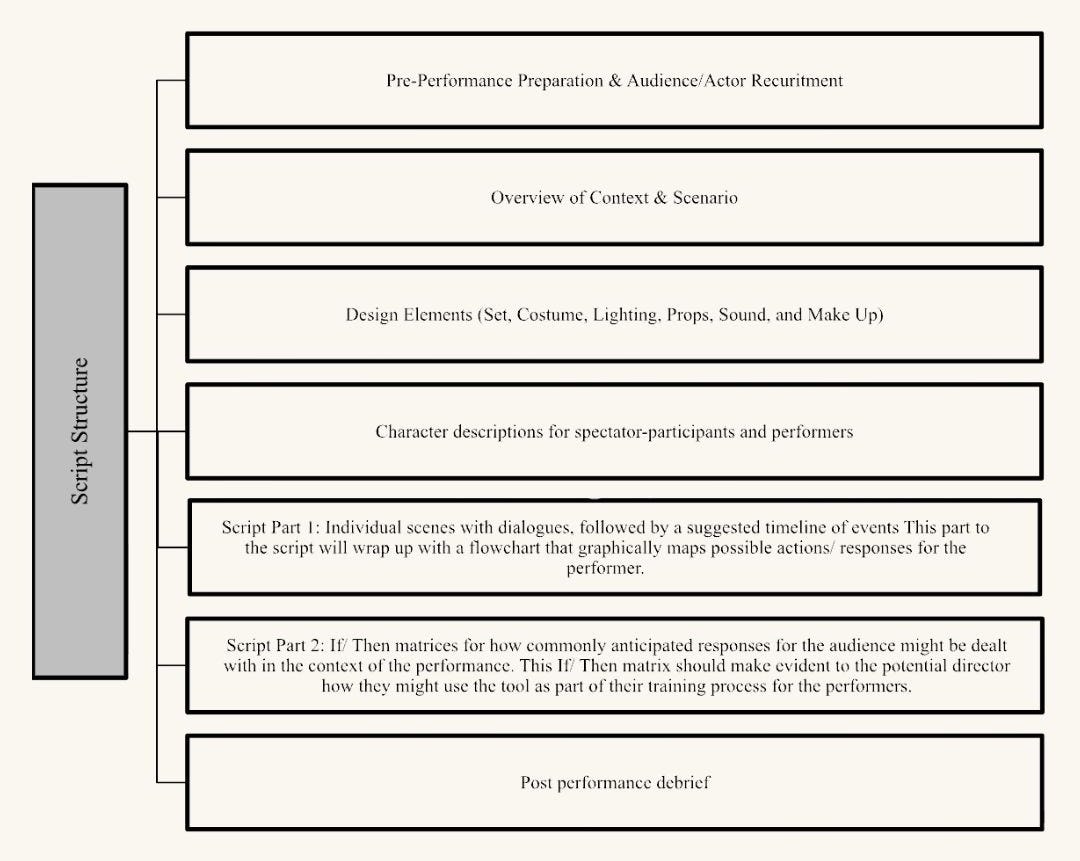 When I set out to develop scripts for immersive theater that could activate audiences and spark dialogue around social issues, I found myself drawing from unexpected sources: tabletop role-playing games, educational simulations, live action role-plays, and even Red Cross training scenarios. From these points of departure, I developed a seven-part framework for scripting immersive theater experiences.